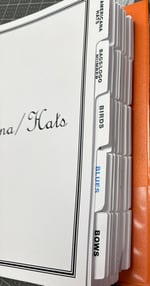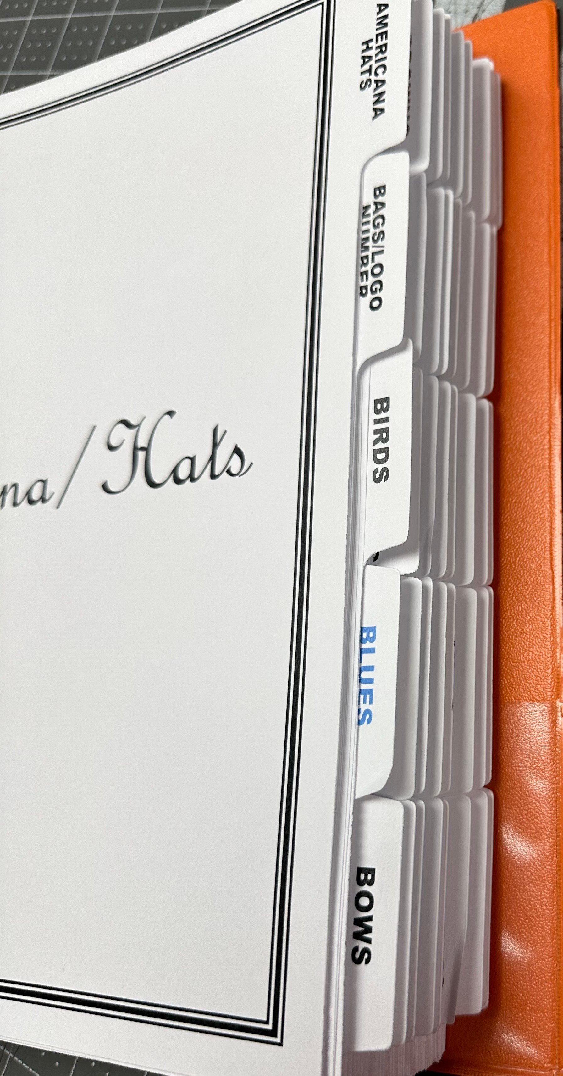 Printed chapter tabs for Patricia Reid Feedsack 3" Swatchbooks. 41 tabs in total.