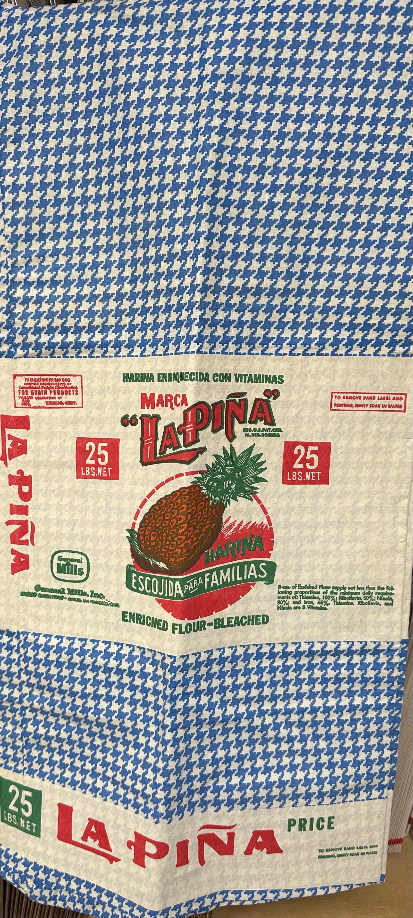 Blue and white check with LaPina flour from General Mills. Label is the same on both sides.